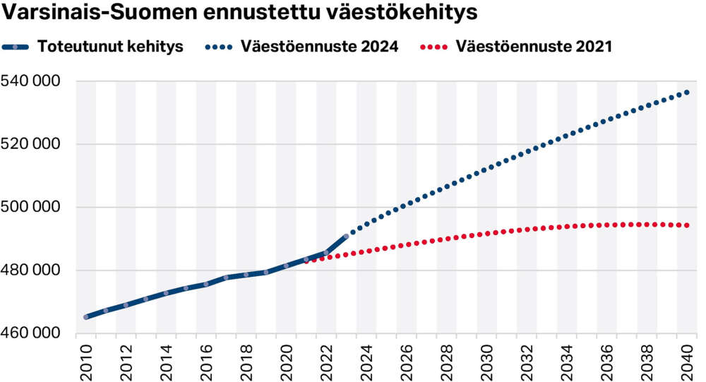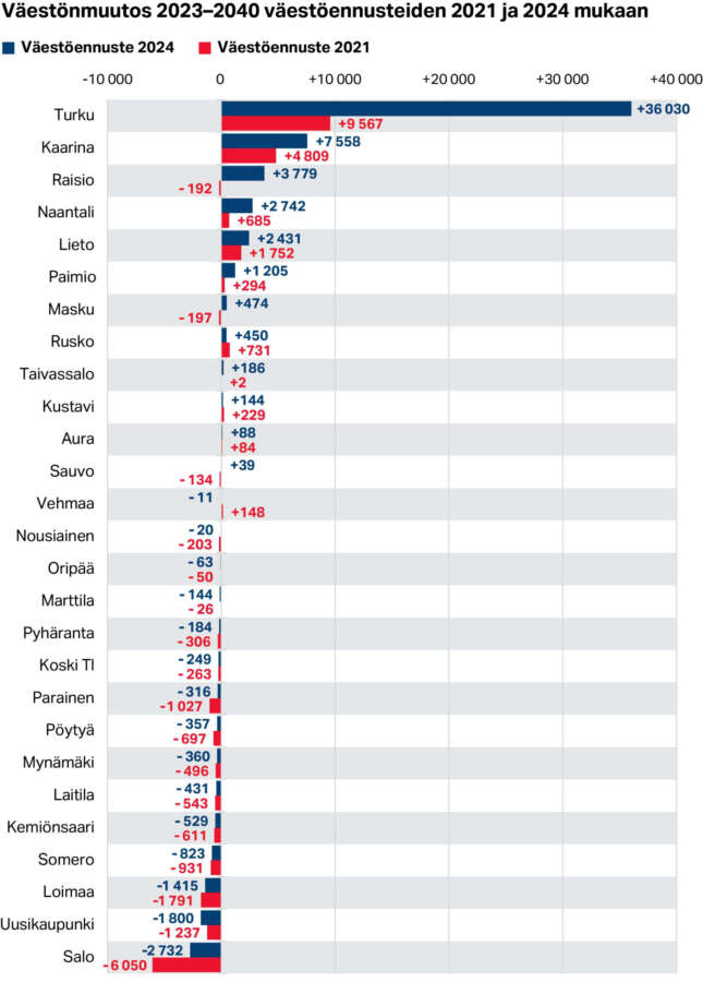Uusi väestöennuste vaikuttaa merkittävästi Varsinais-Suomen ennustettuun väestönkasvuun. Kun vuoden 2021 ennusteessa maakunnan asukasluvun ennustettiin vuonna 2040 olevan 494 000, on uudessa ennusteessa vastaava luku 536 000.