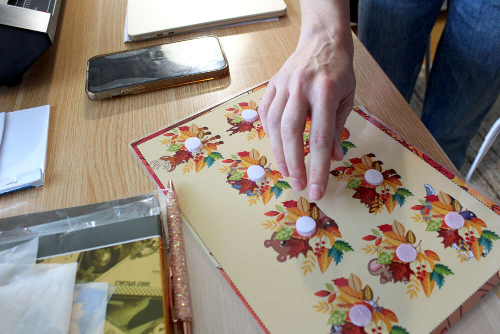 Oksana Balkinalla on omassa olohuoneessa tarrakirjatehdas. Tai oikeastaan se on työpöytä, mutta Balkina kertoo tekevänsä tarvittaessa suuriakin tilauksia.